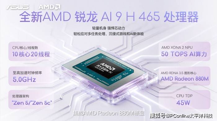 性能方面,它搭载AMD锐龙AI 9 H 465处理器,在性能与轻薄之间实现突破式平衡。该处理器采用10核心20线程设计,支持多线程多任务处理更快,满足多任务办公、游戏娱乐追剧、轻度创作、深度学习等用机场景需求,集成AMD高能核显Radeon 880M,拥有12CU图形核心数,不仅支持视频AV1硬件编解码,还能畅玩主流MOBA、FPS游戏,娱乐办公两不误。依托华硕专业调校技术,基于采用内吹风道、双风扇以及双热管设计的华硕冰锋散热架构,990g极致轻薄机身实现至高45W强劲性能释放,突破轻薄本性能上限。